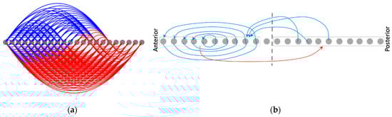 The properties of the individual cells differentiate into characteristic states depending on the relative position of the cell, when initiated from homogeneous conditions (Figure 6). That is, the individual cells’ properties also assume a pattern that reflects the system-level pattern, even though no specific associated targets were provided to them during training. This suggests that patterning at the lower levels (cell properties) may be necessary for patterning at the higher levels (cell states). Furthermore, it can be observed that the asymptotic patterns of the self-weights and cell types are almost bilaterally symmetrical. This means that the cells on the opposite sides of the center behave in symmetrical ways; oppositely signed activity levels tend to change in the opposite directions (as expected). The main reason why the network-level pattern of the asymptotic gap junction weights (Figure 6a) is not bilaterally symmetrical about the center is due to the requirement that the activity states of the anterior and posterior halves should be of opposite signs; thus, the anterior weights are more positive compared to the posterior side, resulting in relatively more positive change in the activity states of the anterior compared to the posterior (Figure 3).