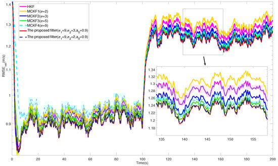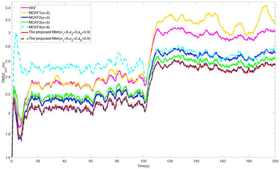 In this example, the measurement sequence is disturbed by impulsive noise with a certain probability. It is evident from the Figures that the estimation accuracy of KF is seriously corrupted during filtering. Generally, a small kernel size can be more effective in attenuating the measurement outliers, but at the same time, it inevitably decreases the filter’s stability, e.g., MCKF1 ( = 2) failed to obtain reliable filtering results due to divergence. By comparing the robustness of MCKF3 ( = 5), MCKF4 ( = 9), and other algorithms to non-Gaussian noise, it can be concluded that, for existing MCKFs, it is difficult to obtain both stable and robustness estimation results.