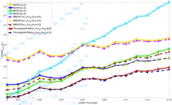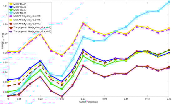 In Figure 3 and Figure 4, the outlier percentage of process noise was fixed as = 0.05, and the ARMSEs of the different filters varying with : 0 ∼ 0.15 are shown. The overall performance of the ARMSEs showed an increasing trend, which means that as the proportion of impulsive noise increased, the estimation accuracy of the filters also decreased. In this test, the MCKFs with different kernel parameters obtained significant filtering accuracy differences. This means that, under the interference of different non-Gaussian noise, the MCKFs with a fixed kernel parameter could not ensure reliable estimation results, and the MCKFs lack enough self-adaptive ability.