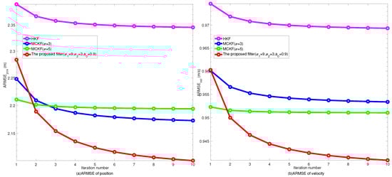 In order to balance the computational efficiency and the filtering performance, it is necessary to choose a reasonable number of iterations for the proposed filter. Figure 5 shows the ARMSEs of filters with different numbers of iterations. For comparison, several filtering results with similar performance in the simulation are also taken into accounts. It can be concluded that the accuracy of the proposed algorithm can be greatly improved after several iterations, and the filtering result also gradually converged. In practical applications, the increase of iteration times brings more computational burden. As shown from Figure 5, when the number of iterations is 3∼5, the filtering algorithm has obtained satisfactory estimation accuracy. Therefore, when considering the accuracy and calculation burden factors, the number of iterations set as 3∼5 is reasonable.