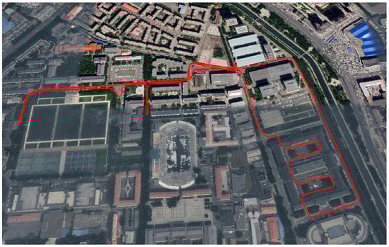 To validate the effectiveness and superiority of the proposed algorithm in this paper, the experimental data collected in a vehicle-mounted INS/GPS integrated navigation experiment was used for the test. The experiment was carried out in the campus of Harbin Engineering University, the test trajectory is shown in Figure 6. A low-cost MEMS-IMU based INS/GPS integrated navigation system is used to provide the navigation data.