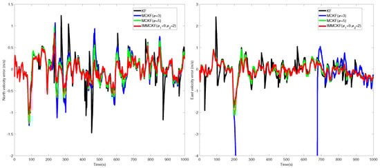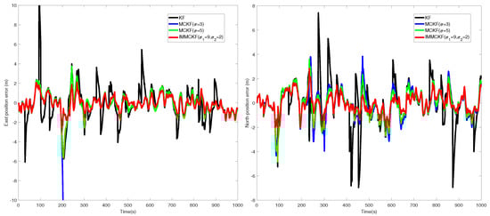 The filter only performs time update while there are no GPS outputs. To compare the robustness of different filters to non-Gaussian measurement noise interference, inspired by the scheme in [,], the gross errors were added artificially to the measurement data. In the integrated navigation system, the velocity and position state variables are susceptible to external interference. Therefore, the velocity and position errors are used for comparison.