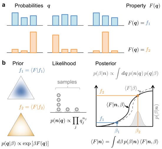 Conceptual framework used to estimate the property  of a stochastic system with probabilities  from a limited number of observations, or samples . (a) Several probabilities  can produce the same value of the property. All such -vectors belong to the same level surface of . (b) Left: Example case in which the property  has circular level surfaces on the simplex embedded in three-dimensional space. Two members of the family of base functions used to expand the prior are shown, containing the different  vectors shown in (a). These two members are solutions of the Maxentropy problem with two different expected values f of the property. Middle: The histogram  generated by the sampled data produces a likelihood  that selective favors a specific range of surface levels. Right: The most favored f value (or equivalently,  value) is the one for which the prior and posterior estimates of the property coincide.