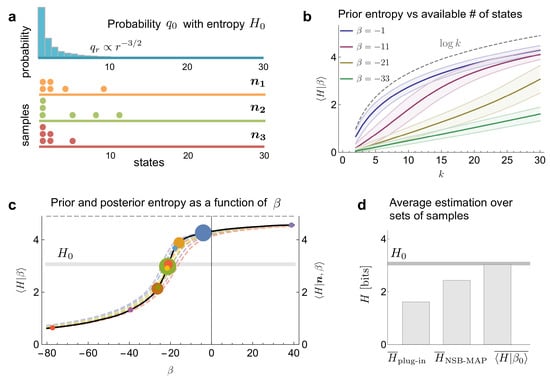 where  belongs to the simplex . We can compare this prior to that used by NSB [], a symmetric Dirichlet . Although there are some similarities, the prior in Equation (29) has non-constant exponents, which hamper the analytical tractability. The posterior reads