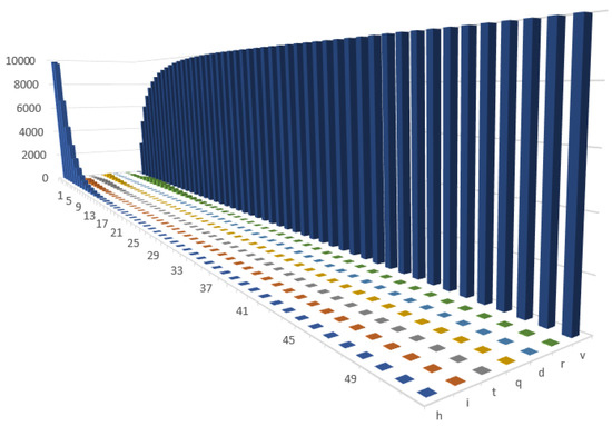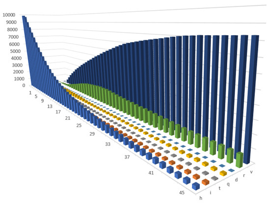 The health status of an agent, their age and location were randomly assigned at the beginning of the simulation (the number of infected agents were set in the initial conditions). In the second module, the characteristics of the agents were recorded in the matrices after each time step. The simulation was conducted for the values of the parameters that had previously been defined. Among the most important characteristics that were recorded after each time step (weekly) were: the health status of each individual in a society (an matrix ), the productivity of each individual in a society (an matrix ), the age of each individual in a society (an matrix ) and the location of each individual on the map after each iteration (x- and y-coordinates) (an matrix ). The full dataset was also recorded in the matrix (an matrix ).