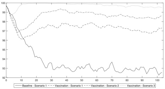 After the introduction of vaccinations, we modified this scenario to include immunity. We will present the results after commenting on the main results that were obtained from the scenarios 2–4 in 2020 in order to facilitate the reference of the results to the original study that we wanted to validate.