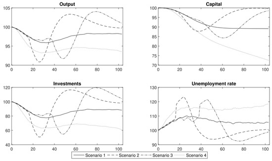 Using the DSGE model and the labour productivity shocks that had been obtained from the agent-based epidemic component, we generated conditional forecasts of the standard macroeconomic indicators: output, capital, investments and the unemployment rate. In Figure 7, we present the results of the four scenarios without immunity (for a description of the scenarios, see Section 4). The analyses were performed for 104 weeks (two years). The results are expressed as the relative difference from the steady-state value. A mean of 10,000 simulations of the model is reported.