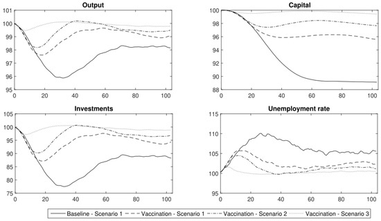 Only in the third scenario with immunity (1.3) was the decrease in output temporary and negligible in the long term. Capital and investment decreased but the contraction was not permanent. The social costs were also low. The unemployment rate increased in the first weeks of the pandemic but decreased after a society had been vaccinated (after obtaining immunity at a level of 90%).
