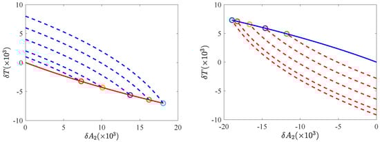 Phase plane trajectories. The CH case is illustrated in the left panel and the HC case in the right panel. Several trajectories are shown for different initial temperatures () for the CH (HC) protocol. The remainder of the system parameters are the same as in Figure 1. In each panel, the solid line (red on the left, blue on the right) represents the second part of the phase trajectory, arriving at the target NESS—the origin . As in the previous figure, red (blue) lines correspond to (). Again in each panel, the dashed lines represent the first part of the phase trajectory, starting from the initial points . These curves end up at the points , marked with circles, at which the dashed and solid lines intersect.
