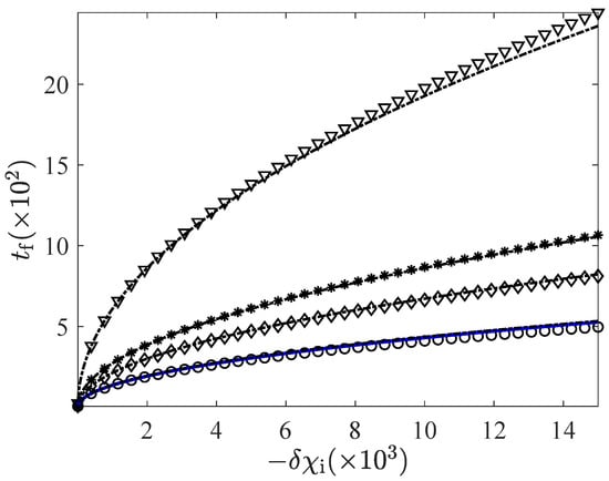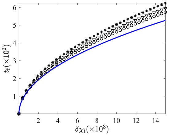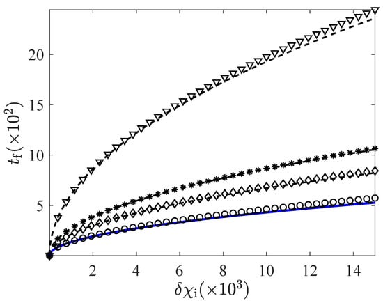 Minimum connection time versus the initial control for the CH case. Symbols represent the linear response prediction for , as given by Equation (29), for different values of the bounds (from top to bottom: and (triangles), and (stars), and (diamonds), and ) (circles). Dashed lines correspond to Equation (39) for each case, which shows the soundness of this approximate expression. The solid line corresponds to Equation (38), which is basically superimposed with the dashed line for and . Other parameters are and .