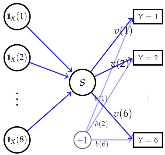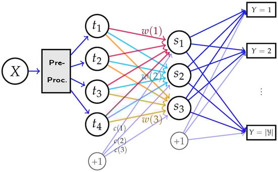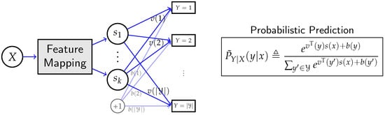 which is obtained by applying the softmax function [] on , where and are the weights and biases in the last layer, respectively (this is equivalent to the common practice that denotes weight and biases by the matrix and the vector , respectively. However, as we will show later, expressing weights v and biases b as mappings of y can better illustrate their roles in feature selection). We will use to refer to when there is no ambiguity.