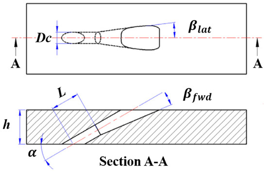 In the current section, the numerical setup is introduced and the calculation results are validated using the experimental data in the open literature. The 7-7-7 shaped hole designed by Schroeder et al. [29] is selected to quantify changes in its cooling effectiveness with and without the effect of the vortex structure. The film cooling hole diameter is 7.75 mm. Detailed geometry of the 7-7-7 shaped hole is illustrated in Figure 1. The injection angle between the hole axis and the main-flow streamwise direction is . The laidback angle and the two expansion angles are all , that is why this hole shape is called the 7-7-7 shaped hole.