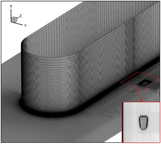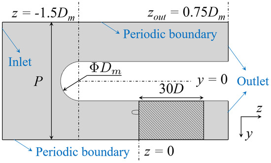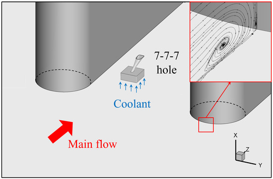 In the current study, to analyze the effect of the vortex structure on film cooling performance, a half-cylinder is introduced to generate the horseshoe vortex, and the computational model is shown in Figure 2. One flow passage with periodic boundaries on both sides is included in the calculation domain to reduce the computation cost. The top view of the final calculation domain is illustrated in Figure 3. Axis X represents the spanwise direction while Y and Z, pitchwise and streamwise directions respectively. The cylinder diameter is 150 mm and the pitchwise distance P is 450 mm. The length ratio between the cylinder diameter and the hole diameter is close to 20, similar to that of the geometry in the turbine cooling design. The main-flow velocity is equal to 22 m/s at the inlet where the turbulence intensity is 5% and the turbulence length scale is estimated to be 10 mm. The calculated Reynolds number based on the leading edge diameter, , is within the range of the real engine conditions. The outlet boundary is open to the atmosphere. The calculation medium in the current study is the ideal gas with constant specific heat, thermal conductivity and viscosity. The inlet temperature of the main flow is set at 300 K and the coolant inlet temperature is 200 K to ensure the density ratio = 1.5. The coolant is supplied by a stagnation plenum, whose cross section is 36. Six different blowing ratios M from 0.5 to 3.0 are included. The relevant parameters are also listed in Table 1 for convenience.