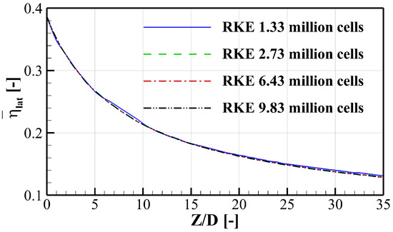 The steady RANS (Reynolds Averaged Navier-Stokes) equations are employed in the current study. The numerical simulations are solved using ANSYS Fluent 19.2, where the “Coupled” pressure velocity coupling scheme and second-order discretization for all variables are adopted [30]. For the grid independence analysis, the film cooling over a flat plate is considered. To obtain the proper mesh density, four different mesh sizes of 1.33 million, 2.73 million, 6.43 million, and 9.83 million cells are selected to compare cooling effectiveness distributions. To be noted, the adiabatic cooling effectiveness is defined in part of the NOMENCLATURE to quantify the cooling performance. Figure 4 plots the laterally averaged cooling effectiveness (over 6D in the lateral direction) distributions along the streamwise direction. It can be seen that there is no significant difference between meshes. The mesh size of 2.73 million cells is selected which is of sufficiently high quality to predict the cooling performance and its differences between larger-size meshes are negligible.