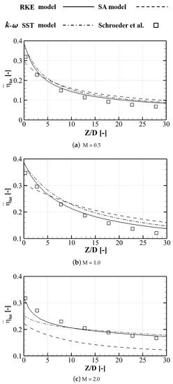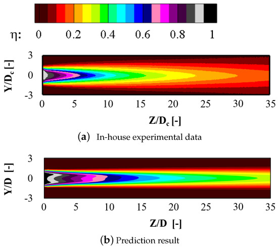 Three different turbulence models including the Realizable k- (RKE), the Spalart-Allmaras (SA), and the k- SST model are examined to compare their results with the experimental data by Schroeder et al. [29]. The laterally averaged effectiveness distributions are plotted in Figure 5. The symbols denote the experimental data and different line patterns represent different turbulence models. There are three blowing ratios included here for the numerical validation. Results come that the RANS simulation with the RKE model can well predict the streamwise distributions of the cooling effectiveness. Based on the above numerical validation analysis, the RANS method with the RKE model is applied. Further comparisons of the two-dimensional effectiveness distributions between numerical results and experimental data are contoured in Figure 6. It can be observed that the numerical result underestimates the coolant lateral spreading by RANS. The phenomena are commonly observed in existing researches [31,32]. However, it is believed that the turbulence model would be very useful in revealing the effect of the passage vortex on the cooling performance.
