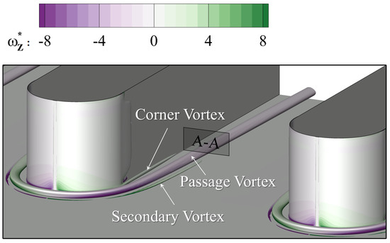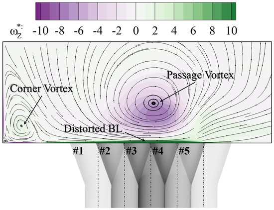 Figure 9 visualizes the vortex structures using the iso-surface of the Q-criterion. It is contoured using the non-dimensionalized Z-direction vorticity to show its sense of rotation. The horseshoe vortex forms in front of the leading edge and migrates following the direction of the main flow. To be clarified that this vortex in the passage is then labeled “passage vortex” (PV) in the current work, in that the main object of the study is to reveal the effect of the passage vortex on film cooling in the endwall region. The corner vortex and the secondary vortex can also be observed. However, their intensity is weaker and dissipates along the streamwise direction. The slice A-A is located at the trailing edge of the cooling hole. Figure 10 contours the vorticity distribution at the slice A-A. The vector lines identify directions of the local velocity, similar to streamlines. The corner vortex stays close to the blade surface and a much smaller vortex structure is induced in the corner region. Due to their weak vorticity intensity, they will not be considered in the current study. The large-scale passage vortex dominates the flow field in the passage. It distorts the beneath boundary layer and induces vorticity with opposite rotation direction. The boundary layer is labeled “BL” in Figure 10. These characteristics will directly influence the flow field at the outlet of the cooling hole.