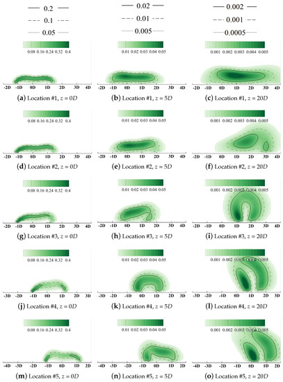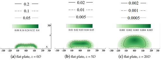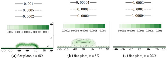 Streamwise slices at z = 0D, 5D, and 20D are selected to demonstrate local distributions of the volumetric entropy generation rate. Results are contoured in Figure 13 and Figure 14.