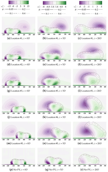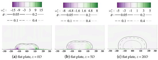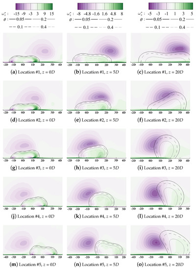 The horizontal relative axis lies in the pitchwise direction and the vertical axis x is in the spanwise direction. It should be clarified that the original point of the axis denotes the pitchwise location of the cooling hole centerline, but its corresponding y value varies for different hole locations in the following sections. Distributions of the vorticity with isolines denoting values of the non-dimensionalized temperatures are contoured in Figure 15 to add details of the flow field and reveal the dynamic mechanism during the injection/mainstream interaction.