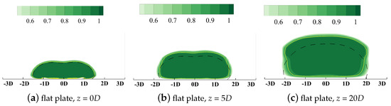 The distributions are contoured in Figure 16 which supports the scale analysis given above. The dashed line denotes the non-dimensionalized temperature value at , which can be deemed as the boundary of the cooling injection. The yellow solid line is the isoline where contributes 90% of the overall . It can be observed that the thermal entropy generation dominates in the region where the cooling injection mixes with the main flow. Therefore, in the following sections, only the thermal irreversible entropy generation, , will be included to analyze the loss of the cooling capacity during the mixing process. However, it should be clarified that, for the region inside the boundary layer and in the main-flow passage, the viscous effect still dominates. This coincides with the conclusions in the researches by Lin and Li [42,43] where no coolant is injected into the main flow.