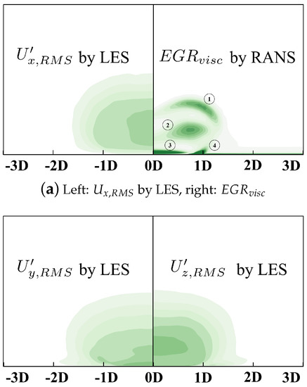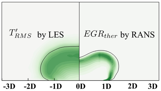 Based on definition, can be theoretically divided into two parts, contributed by the steady effect and the unsteady effect. The latter one is closely related to the turbulence fluctuation. Greater temperature fluctuation, for example, results in higher thermal irreversible mixture correspondingly. Therefore, by RANS should be reasonably related to the fluctuation term, for example that resolved by LES. The results can reasonably stand on the conclusion that the RANS simulation is able to resolve the local high-EGR or low-EGR and reveal the underlying mechanism. Root-mean-square (RMS) fluctuating temperature and fluctuating velocity by high-accuracy LES are demonstrated to posteriorly support the entropy generation rate (EGR) calculation in the current study. The contour of the root mean square of the fluctuating temperature is illustrated in Figure 17.