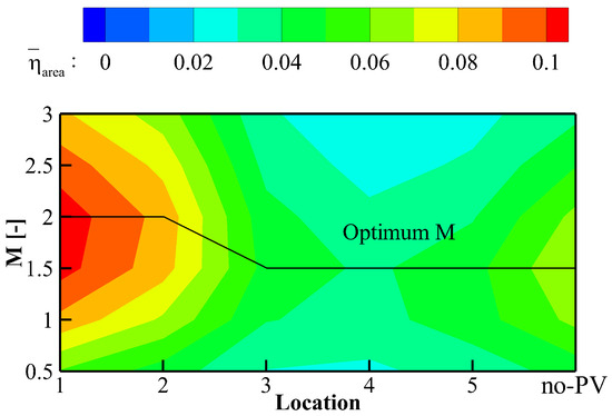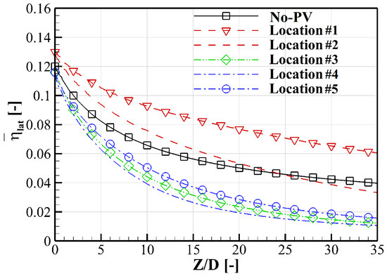 The streamwise position of the cooling hole can be seen in Figure 3. For the pitchwise direction, five relative positions are included labeled from “#1” to “#5” on the upper left in Figure 10 at intervals of . The #3 hole locates beneath the core of the passage vortex. The first two locations are in the downwash region of the vortex and the last two in the upwash region, as defined by Ligrani et al. [24,25,26]. The effect of the hole position will be discussed in the following section.