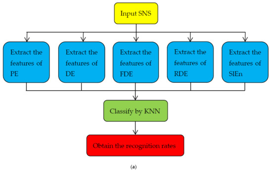 In recent years, some complexity-based feature extraction methods of SNS have been proposed, and tremendous amounts of research show that they are more efficient than traditional feature extraction methods. The complexity features include permutation entropy (PE) [20], dispersion entropy (DE) [21] and its improved algorithms, such as fluctuation dispersion entropy (FDE) [22,23] and reverse dispersion entropy (RDE) [24]. In 2002, PE was proposed for the first time; its advantages are simplicity, exceedingly fast calculation, robustness, etc. [25,26,27]. With the development of PE, it has gradually become more widely used in the field of SNS feature extraction, and the improved algorithms of PE were proposed and applied successively in the following years, such as reverse permutation entropy (RPE) [28], weighted-permutation entropy (W-PE) [29,30], and multi-scale permutation entropy (MPE) [31,32]. In 2016, DE was proposed for the first time; this can quantify the uncertainty of time series, detect the noise bandwidth and simultaneous frequency and amplitude change [33]. In the next three years, some improved algorithms (MDE, FDE, and RDE) of DE were proposed, and their performances for SNS feature extraction have proved better than DE [34,35].