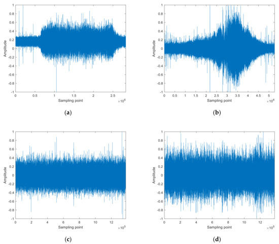 Single feature extraction is implemented for four types of measured SNS, termed ship–①, ship–②, ship–③, and ship–④. Ship–① and ship–② derive from the same website [39] and represent an ocean liner and a motorboat, respectively. Ship–③ and ship–④ derive from another website [40] and represent an Alaska state ferry and a cruise ship, respectively. The length of sampling point for ship–① is 2,828,835, the sampling length for ship–② is 5,269,916, and the sampling length for ship–③ and ship–④ is 1,380,000. The sampling frequency of ship–① and ship–② is 52,734 Hz, and the sampling frequency of ship–③ and ship–④ is 44,100 Hz. The normalized four types of SNS are shown in Figure 3.