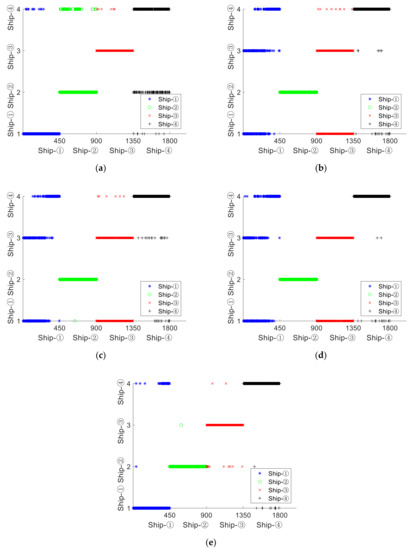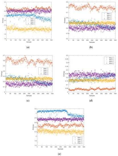 It can be seen from Figure 4 that, for PE distribution, the entropies of ship–①, ship–②, and ship–④ are close to each other; that, for DE, FDE, and RDE distribution, the entropies of ship–①, ship–③, and ship–④ are similar to each other; that, for SlEn distribution, only a few entropies of ship–① approach equality with a few entropies of ship–④. It can be concluded that SlEn has better inter-class separability for the four types of SNS.