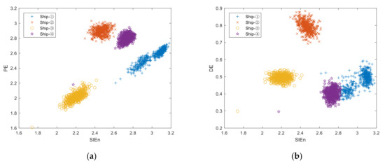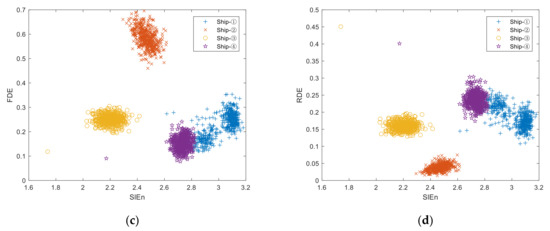 It can be seen from Figure 6 that, for SlEn&PE distribution, the points of the entropies of the four kinds of ships are far away from each other; that, for SlEn&DE, SlEn&FDE and SlEn&RDE distribution, some entropies of ship–① are nearly equal to some entropies of ship–④. This indicates that SlEn&PE has better inter-class separability for the four types of SNS.