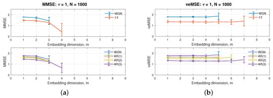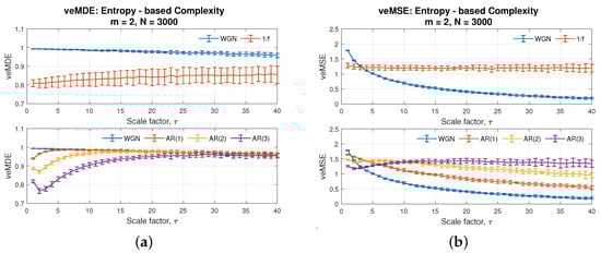 Figure 1b, where the embedding dimension ranges from 1 to 9, shows that, unlike MMSE, the veMSE analysis was able to give a defined entropy value, even at high embedding dimensions and for a complex correlated structure, as, e.g., the AR(3) process at the scale of 7. Additionally, with standard MMSE, signals with higher randomness are more likely to yield unstable estimates as the embedding dimension increases. However, even in the case of white Gaussian noise with the highest randomness, the veMSE with the embedding dimension m = 5 was able to successfully and stably process the data. On the other hand, traditional multiscale sample entropy methods fail to give a defined value with the embedding dimension higher than 3, under the same condition []. Therefore, from the viewpoint of estimation stability, veMSE exhibits a marked improvement, when it comes to assessing complex information in high dimensions.