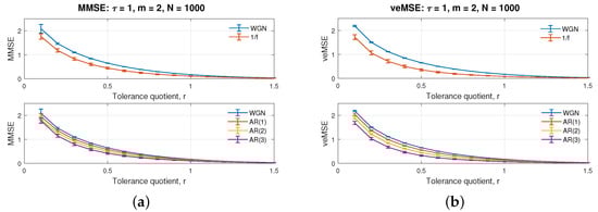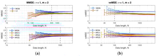 Figure 2b illustrates the performance of a single scale of veMSE, as a function of data length, N, in a logarithmic scale. The embedding dimension was set to , and the choice of tolerance was the same as before. The values of veMSE for white and noise were not defined before N = 40, while for AR(2), they were not defined when N was smaller than 30. The smallest sample sizes for the veMSE to reliably compute entropy estimates for AR(1) and AR(3) were also N = 40.