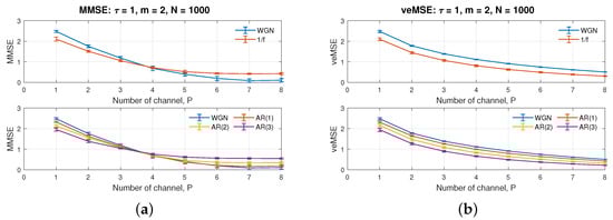The number of channels, P, is closely related to the setting of the embedding dimension, m, and the performance of veMSE. We have showed that the veMSE is able to give complexity estimation under higher embedding dimension in Figure 1b, the higher embedding dimension will be assigned to consecutive data sub-channels. Figure 4a,b illustrate the influence of the number of data channels on MMSE and veMSE. The default parameters were set to m = 2, N = 1000, and = 1.