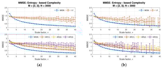 Behaviour of Multivariate Multiscale Sample Entropy [], for WGN, 1/f noise, and AR processes, with the embedding dimension set as (a) [2, 2] and (b) [2, 3].