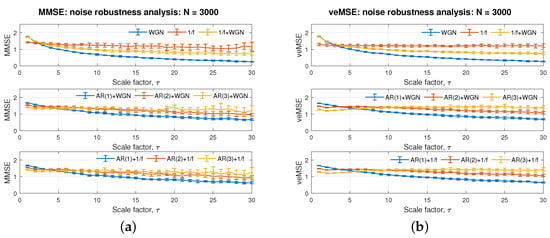 In the middle and bottom panel in Figure 7b, the results of veMSE for AR models with uncorrelated white noise and correlated flicker noise are presented, to contrast to the outcomes of pure AR signals in Figure 6b. The amplitude of the added noise signal was set to of that for the AR signals. Compared to Figure 6b, the gaps between the complexity curves for the AR models of varying order decrease with noise. However, even that the gap among distinct models is narrowed down, separation can still be achieved at high scales in of the noisy scenarios, while in case of MMSE, noisy AR signals with different complexity cannot be well separated and the impact of noise is clearly shown in Figure 7a. Given these points, the performance of complexity estimation, based on veMSE, is consistent with cases without noise, a unique feature of veMSE that is not present in the other MSE algorithms, thus demonstrating the potential in practical recording data sets.