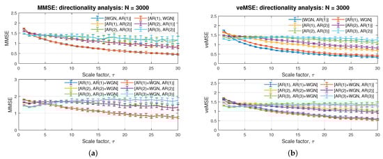 For multivariate analysis, the directionality refers to the issue that the optimal ordering of the input channels is unknown; it is, therefore, desirable that an algorithm is independent of channel ordering. Yet, without prior knowledge related to the optimal channel order, the performance of the estimation will be impacted in standard entropy-based algorithms. To this end, the directionality of the veMSE is next analysed for bivariate systems. Figure 8b shows two graphs, each containing three pairs of curves. The top panel depicts the results for white noise with AR(1), AR(1) with AR(2), and AR(2) with AR(3), with the order of input shown by legend (first present, first processed). As can be seen from this figure, the estimates at a lower scale are mainly influenced by the first input signal. For example, the blue line [WGN, AR(1)] can be clearly recognized as lower than the red one [AR(1), WGN] at the beginning, especially in the single-scale case. As the scale increases, the two lines approach the same level; a similar trend can be seen for the other two pairs.