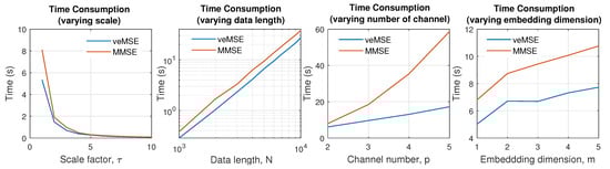 Entropy analysis based on multichannel signals is more time-consuming than single variate estimation, so that calculation efficiency becomes one of the critical factors that needs to be carefully considered. Therefore, in this subsection, time consumption of veMSE is discussed and compared with the commonly used MMSE.