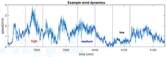 Wind data was recorded by 3D ultrasonic anemometers, at a sampling frequency of 50 Hz. The recording process was implemented in the Institute of Industrial Science of the University of Tokyo []. Three channels, containing wind speed into the east-west, north-south, and vertical direction, were recorded. The wind regimes, containing different dynamics, were defined as the low, medium, and high by the magnitude of wind speed, as shown in Figure 10. The parameters involved in veMSE analysis were set to m = 2, L = 1, , and N = 3000. Illustrations of entropy results were averaged over 10 trials for each channel and displayed as error bars, based on the standard error of the mean. In addition, time-shuffled wind data sets were also tested and compared with the obtained wind dynamics. The shuffled wind samples were generated from the recorded wind signals but with a randomised order. In this case, the possible correlations within signals were broken down but the statistical properties were preserved.