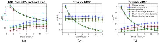 The same trails were analyzed by multivariate multiscale sample entropy, as shown in Figure 11b, which revealed the relation of the three wind regimes in an expected way; that is, with mild wind exhibiting the highest complexity, followed by the high and low dynamics regimes. Further, all the three wind regimes were able to present higher long-range correlation than their surrogate data sets, after = 5; however, the overlapped areas can be found across all the scales. Observe from Figure 11c that, as desired, although the scale factor need to be set up to 11, the long-range correlation of different wind speeds was detectable by the proposed veMSE, resulting in a more obvious separation among the different wind regimes, as compared to MSE and MMSE.