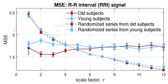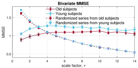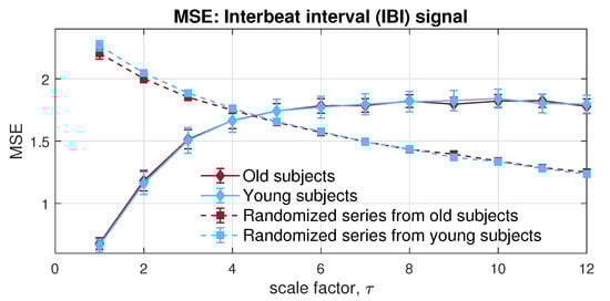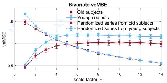 Next, the MMSE was applied to the bivariate channels composed of the RRI and IBI signals. Observe from Figure 14, the resulted error bars indicate higher dynamical complexity in young participants than of that in elderly individuals, which conforms with the complexity loss theory due to aging []. Moreover, both physiological data sets showed higher long-range correlation than the randomized surrogate series in an expected way; yet, as scale increases, an overlapping area can be observed, due to the lack of sufficient sample length at larger scales, owing to the coarse graining process. In contrast with MMSE, the veMSE in Figure 15 gave the correct and clear estimation, with enhanced stability, particularly in large scales. In practical scenarios, the size of recorded signals is mostly limited; hence, the veMSE better facilitates the analysis of physical and physiological signals when identifying dynamical differences based on nonlinear features.