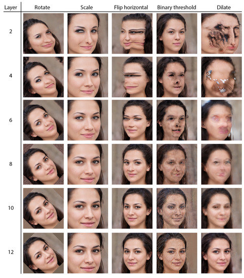 A comparison of various transformation layers inserted and applied to all of the features in different layers in the StyleGAN2 network trained on the FFHQ dataset, shows how applying the same filters in different layers can make wide-ranging changes the generated output. The rotation transformation is applied by an angle . The scale transformation is applied by a factor of . The binary threshold transformation is applied with a threshold of . The dilation transformation is applied with a structuring element with radius pixels.