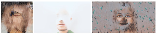 Three illustrative samples from using network bending in the production of artworks. Left: an image from the series of artworks Teratome [53]. Middle: a still from the video piece Fragments of Self [55]. Right: a still from the video piece Disembodied gaze [54]. Images reproduced with permission from the copyright holder.