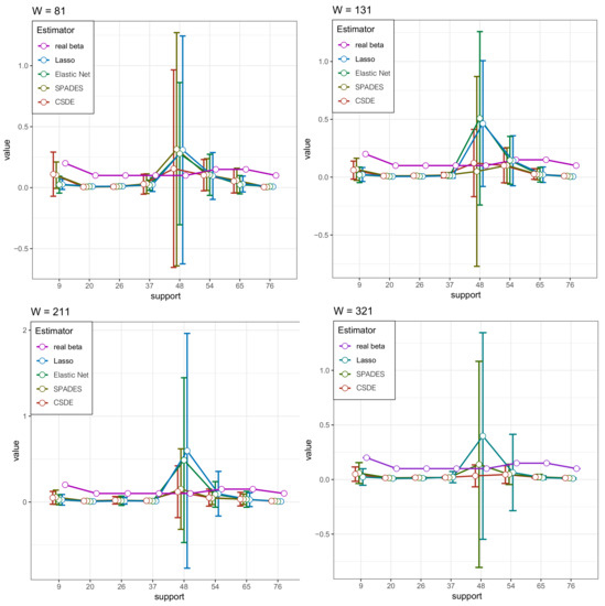 Under the Beta-min condition, the support estimation is very close to the true support of . The probability of the event is high when W is growing. The recovers the corrected support with probability at least . The result is non-asymptotic and it is true for any fixed W and n. There is a similar conclusion about support consistency (see Theorem 6 of [25]).