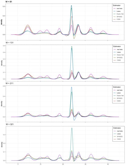 In the real data, we often encounter the situation that the i.i.d. samples are contained by some zero-mean measurement errors ; see [12,13,14,15,16]. For density estimation of , if there exists orthogonal basis functions, the estimation method is quite easy. In the measurement errors setting, however, finding an orthogonal-based density function is not easy (see [17]). Ref. [17] suggests the assumption that the conditional distribution function of given is known. This condition is somewhat strong since most conditional distributions cannot obtain the explicit formula (except the Gaussian distribution). To address this predicament, particularly with nonorthogonal base functions, the SPADES model is attractive and makes the situation easier to deal with. Based on the SPADES method, our approach is an Elastic-net calibration approach, which is simpler and more interpreted than the conditional inference procedure proposed by [17]. In this paper, we proposed the corrected loss function to debiasing the measurement errors, and this is motivated by [18]. The main problem of considering measurement errors in various statistical models is that they are responsible for the bias of the classical statistical estimates; this is true, e.g., in linear regression, which has traditionally been the main focus of studies related to measurement errors. Debiasing represents an important task in various statistical models. In linear regression, it can be performed in the basic measurement errors (ME) model, which is also denoted as the Errors-in-variables (EIV or EV) model, if it is possible to estimate the variability of measurement errors (see [19,20]). We derive the real variable selection consistency based on weighted + penalty [21]. At the same time, some theoretical results of SPADES only contain the situation of the equal weights setting, which is not plausible in the sense of adaptive (data-dependent) penalized estimation. Moreover, we perform the Poisson mixture model to approximate the complex discrete distribution in the simulation part, while existing papers only emphasize the performance of continuous distribution models. Note that the multivariate kernel density estimator can only deal with a continuous distribution, and it requires a multivariate bandwidths section, while our method is dimensional-free (the number of the required tuning parameters is only two). There has been quite a lot of work in this area, starting with [22].