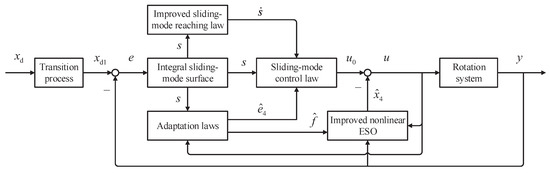 In this section, for the purpose of improving the tracking performance of the rotation system, a sliding-mode control with an improved nonlinear extended state observer (SMC-INESO) is proposed. As shown in Figure 4, the proposed SMC-INESO is composed of the transition process, the improved nonlinear ESO, the integral sliding-mode surface, the improved sliding-mode reaching law, the sliding-mode control law, and the adaptation laws.