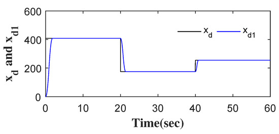 The rotation speed set according to rock properties, expressed by , is a step signal. Overshoot may occur when the system quickly tracks the signal. To solve the issue, the following discrete second-order transition process is employed to convert the step signal to a continuous one [27].
