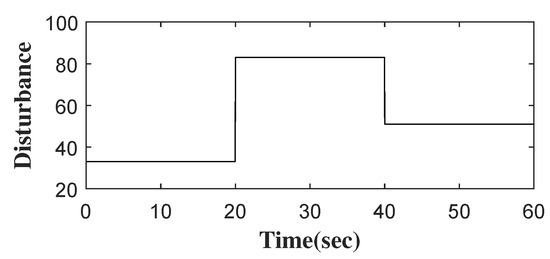 Considering roadway support in Jincheng Sihe Coal Mine [3], the surrounding rock characteristics of the roadway are listed in Table 1. The rotation speed is set according to the characteristics of the surrounding rock. As shown in Figure 5, the step rotation speed is converted to a continuous one by the transition process. In the actual roadway support, some elements in the actual rotation system, such as , may change suddenly and form a sudden disturbance, which is a challenge to the rotation speed control of a hydraulic anchor [3]. The total disturbance, represented by , is shown in Figure 6.