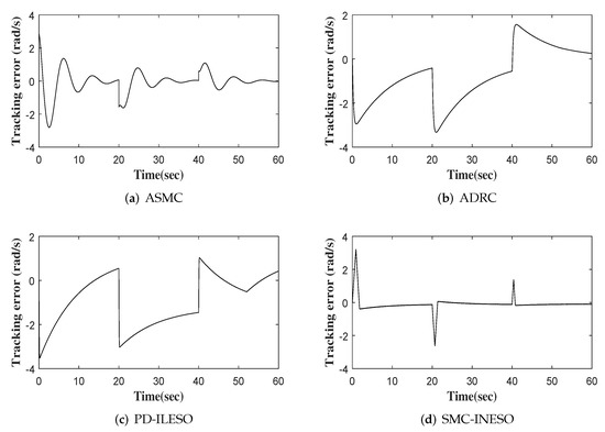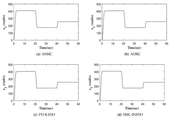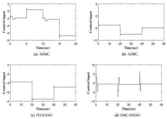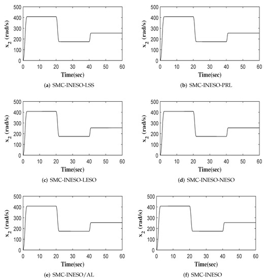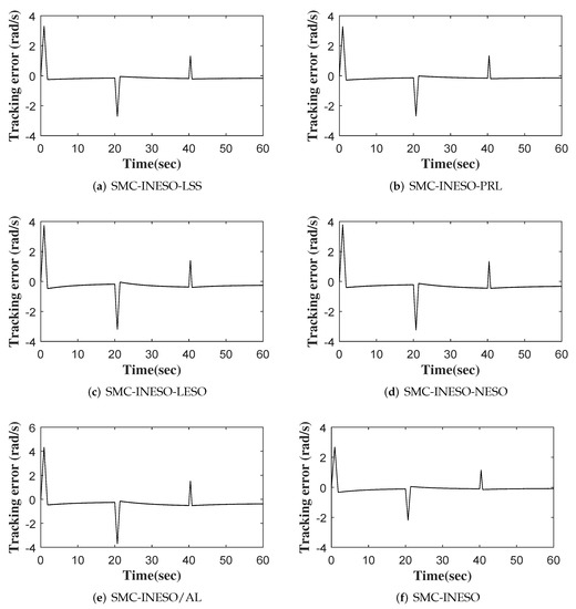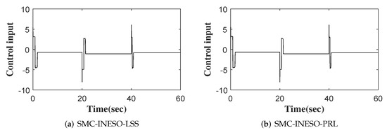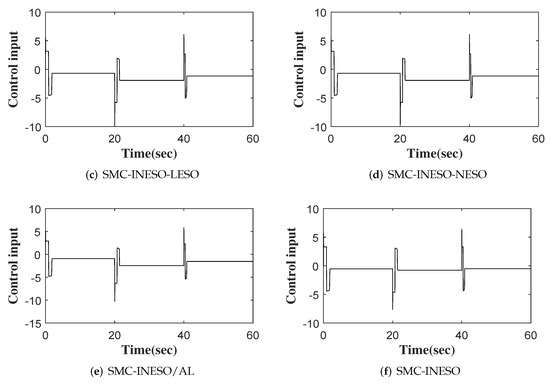 For the purpose of verifying the effectiveness of the developed controller, five control methods are compared with SMC-INESO. In the SMC-INESO, , , , , , , , , = 6, , , =1, = 2, = 4, and = 0.8.