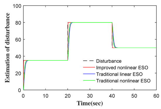The outputs of six comparative control methods are shown in Figure 7. The tracking errors and control inputs of six control methods are shown in Figure 8 and Figure 9. Moreover, as listed in Table 2 and Table 3, eight performance indices in terms of tracking error and control input, i.e., maximum absolute error (MAAE), mean absolute error (MEAE), standard deviation of absolute error (SDAE), integral time absolute error (ITAE), maximum absolute control input (MAACI), mean absolute control input (MEACI), standard deviation of absolute control input (SDACI), and the integral time absolute control input (ITACI), are used to compare the control performance of the six control methods. It can be seen from the experimental results above that the SMC-INESO achieves the smallest average tracking error with the smallest average control input. In addition, by comparing it with the five control methods, it is verified that the strategies proposed in the SMC-INESO, namely the improved nonlinear ESO, the integral sliding-mode surface, the improved sliding-mode reaching law, and the adaptation laws, contribute to the improvement of control performance. In order to verify the estimate performance of the improved nonlinear ESO in the SMC-INESO, traditional linear and nonlinear ESOs are employed for comparison. The estimations of disturbance obtained by the three ESOs are shown in Figure 10. It can be seen from the comparative simulation results that the proposed nonlinear ESO has better estimation accuracy. Therefore, the SMC-INESO with the proposed ESO has stronger anti-disturbance ability.
