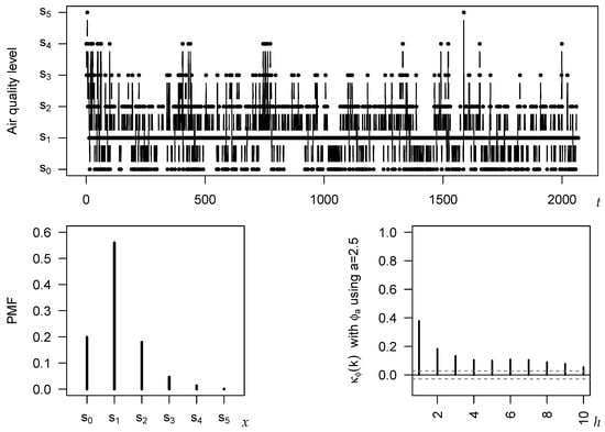 In this article, we considered the family of cumulative paired -entropies. For each appropriate choice of the EGF , an ordinal dispersion measure is implied. For example, particular choices from the families of a-entropies or q-entropies, respectively, lead to well-known dispersion measures from the literature. The first main contribution of this work was the derivation of the asymptotic distribution of the sample version for ordinal time series data. These asymptotics can be used to approximate the true distribution of , e.g., to compute approximate confidence intervals. Simulations showed that these asymptotics lead to an excellent finite-sample performance. Based on the obtained expression for the asymptotic bias of , we recognized that each EGF also implies a -type serial dependence measures, i.e., altogether, we have a matched pair for each EGF . Again, we analyzed the asymptotics of the sample version , and these can be utilized for testing for significant serial dependence in the given ordinal time series. This time, however, the finite-sample performance clearly depends on the choice of . Choosing based on an a-entropy with , such as , ensures good finite-sample properties. The practical application of the measures and their asymptotics was demonstrated with an ordinal time series on the daily level of air quality in Shanghai.