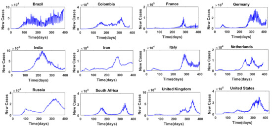 To study the temporal dynamics of COVID-19, we consider two different types of COVID-19 time series from 40 countries/regions around the world. The two types of time series are: (1) daily COVID-19 cases; and (2) daily COVID-19 deaths. The data are obtained from the Our World in Data (OWID) website: https://ourworldindata.org/ (accessed on 30 March 2021). The 40 countries/regions considered in this study include 33 countries (including many of the countries that have been severely affected, such as Brazil, Germany, India, Italy, the United Kingdom, and the United States) and seven regions (Africa, Asia, Europe, European Union, North America, South America, and World). Since the start of COVID-19 happened at different times in different countries, the starting times of data available and, hence, used in this study for different countries/regions are also different, but data until 20 March 2021 are considered for all the countries/regions studied. However, for each country/region, at least one year of data is considered.